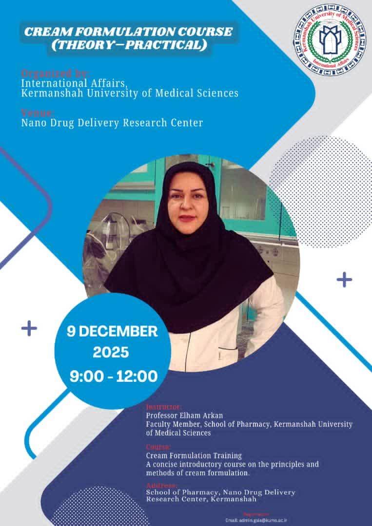 <strong>به اطلاع علاقه مندان می رساند کارگاه فرمولاسیون کرم توسط سرکار خانم دکتر الهام ارکان در روز سه شنبه مورخ 1404/9/18 در کلاس شماره 9 دانشکده داروسازی از ساعت 9 الی 12 برگزار می گردد.</strong>